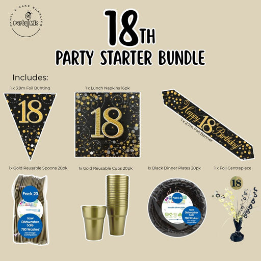 Get your celebration sparkling with the 18th Party Starter Bundle in Black & Gold! This set includes everything you need to kick off your party...