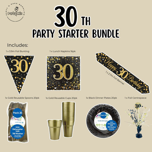Get your celebration sparkling with the 30th Party Starter Bundle in Black & Gold! This set includes everything you need to kick off your party...