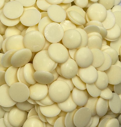 Creamy white coloured pieces of non tempering compound chocolate. High Quality bakery grade chocolate