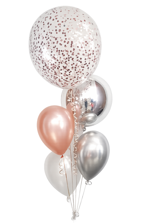 View full detailsAdd a wow factor to your next event with this elegant rose gold and silver balloon bouquet. This helium bouquet consists of a jumbo 60cm confetti b...
