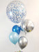 Add a wow factor to your next event with this elegant blue and silver balloon bouquet. This helium bouquet consists of a jumbo 60cm confetti balloon, a silver orbz balloon, a metallic royal blue balloon, a metallic light blue balloon, a metallic silver balloon all tied down to a silver balloon weight.