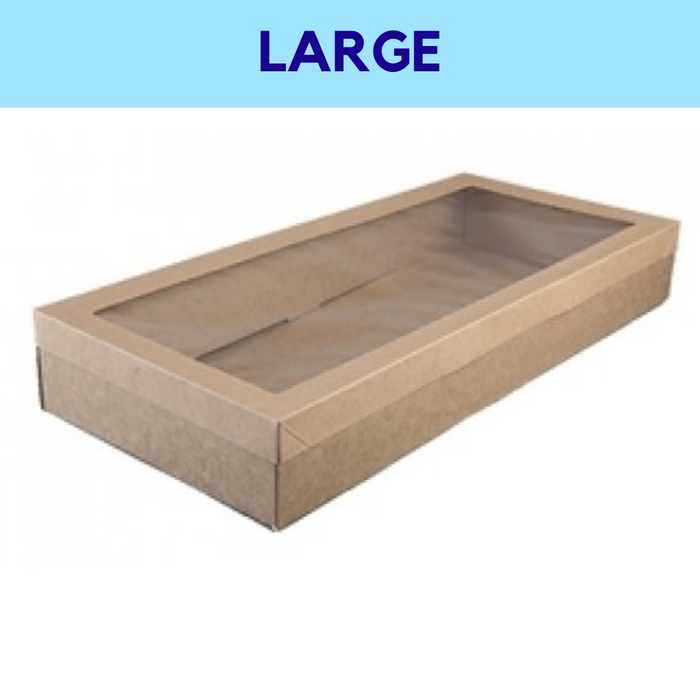 RECYCLABLE - HEAVY DUTY - STYLISH - GREAT FOR FOOD DISPLAY & TRANSPORT Our strong and sturdy brown kraft corrugated cardboard catering trays are are a stylish and environmentally friendly option for food display, transport and delivery. They are recyclable and are an excellent alternative to traditional plastic packaging. Perfect for cookies and desserts.