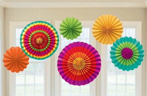 Pack of 6 Fiesta Coloured Paper Fan Decorations. Pack contains fans in the following sizes - 2 paper fans measuring 40.6cm 2 paper fans measuring 3...