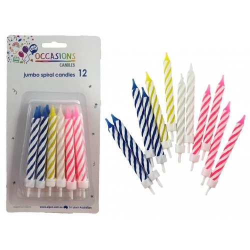 Add a festive touch to any birthday celebration with these Birthday Candles Jumbo Spiral with holders. Each pack comes with twelve giant rainbow-colored candles that can stand out from the pack for a truly special celebration.