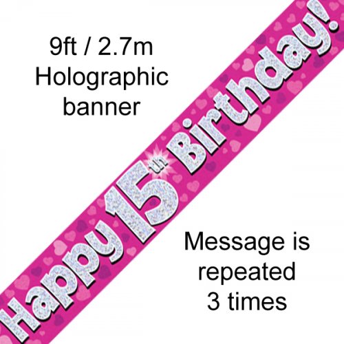 Pink Holographic 15th Birthday Banner. Message is repeated 3 times. Length of banner is 2.7m. Banner can be cut up or displayed as a whole.